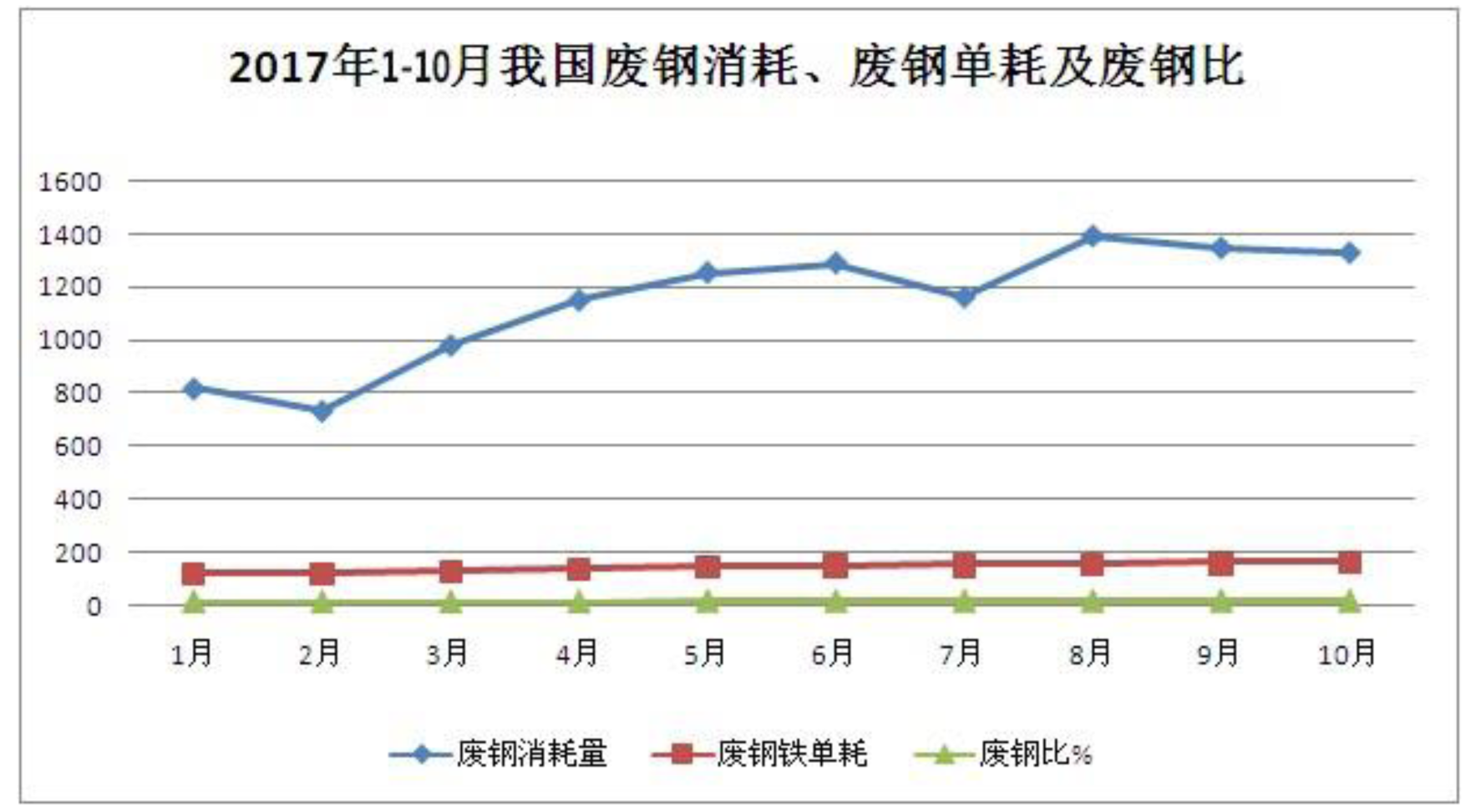 今年1-10月份全国粗钢产量70950万吨,同比增加3654万吨,增幅5.4%。炼钢消耗废钢铁总量11451万吨,同比增加4221万吨,增幅58.4%。这是我国钢铁工业在1996年粗钢产量首次突破一亿吨后时隔21年,炼钢废钢铁消耗总量首次突破一亿吨,预计到年底炼钢消耗废钢铁总量可达1.4亿吨左右。它标志着我国钢铁工业大规模应用废钢铁的时代已经到来。今年前10个月,废钢综合单耗161.4KG/T,同比提高54KG/T,废钢比为15.96%,同比提高4.9个百分点。其中,转炉废钢单耗125kg/T,同比提高56.5KG/T,电炉废钢单耗621KG/T,同比提高18.7KG/T,电炉钢比7.35%,同比提高0.09个百分点。